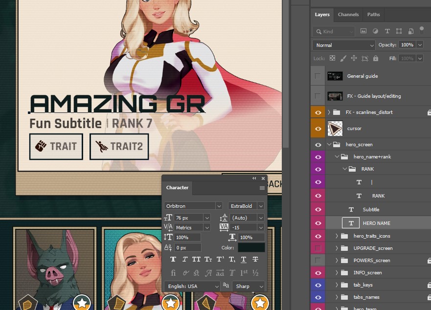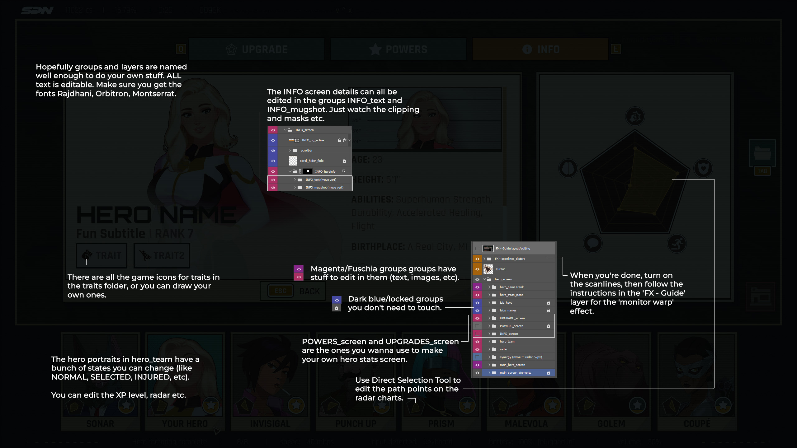 There are a bunch of 'trait' icons to give your traits, and all of the in-game hero portraits can be on the team at the bottom by turning them on and changing the names. There are some elements that are using masks, shapes (which are a bit of a pain in photoshop) and fx layers (with things like stroke, color overlay etc) so watch for those.