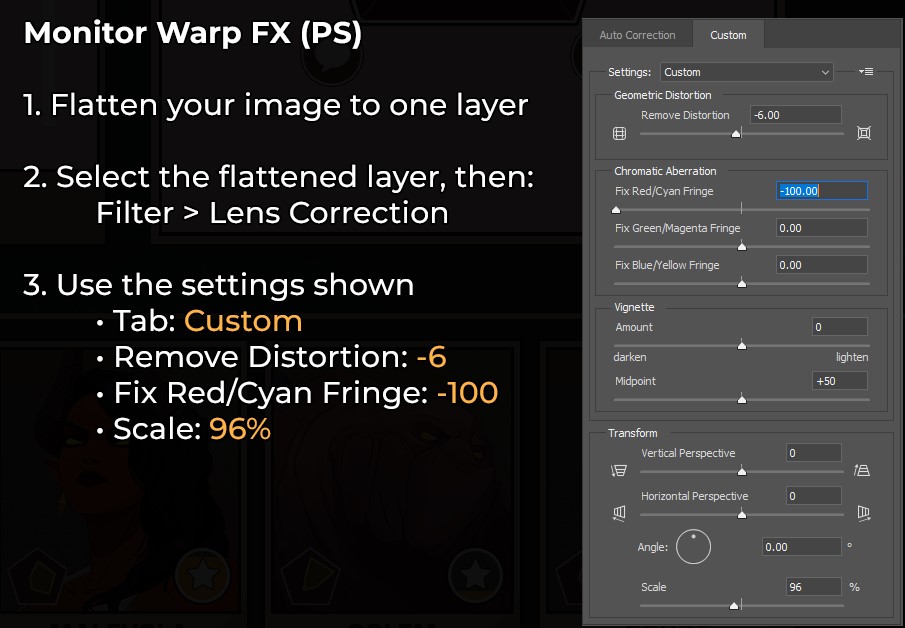 When you are done remember to turn on the 'scanlines' and make a flattened version so you can do the monitor warp FX effect (Filter > Lens Correction settings instructions in the file).